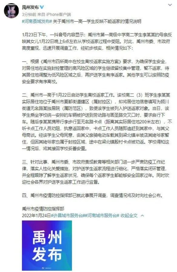 1月24日,河南禹州市就“河南一学生18次核酸阴性仍在防疫卡点被拦截”一事发布情况说明。1月23日下午,一抖音号内容显示:禹州市第一高级中学高二学生李某某的母亲反映其女儿1月22日晚上6点左右从学校返家过程中受阻。对此,禹州市委、市政府高度重视,迅速开展调查工作,经初步核实,相关情况如下: